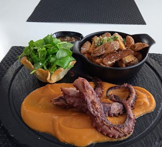 creveţi Black Tiger, cozi creveţi, baby caracatiţă, midii, calamar, apio, ulei picant, roșii cherry, busuioc, unt, sos roșii, pâine prăjită cu usturoi
